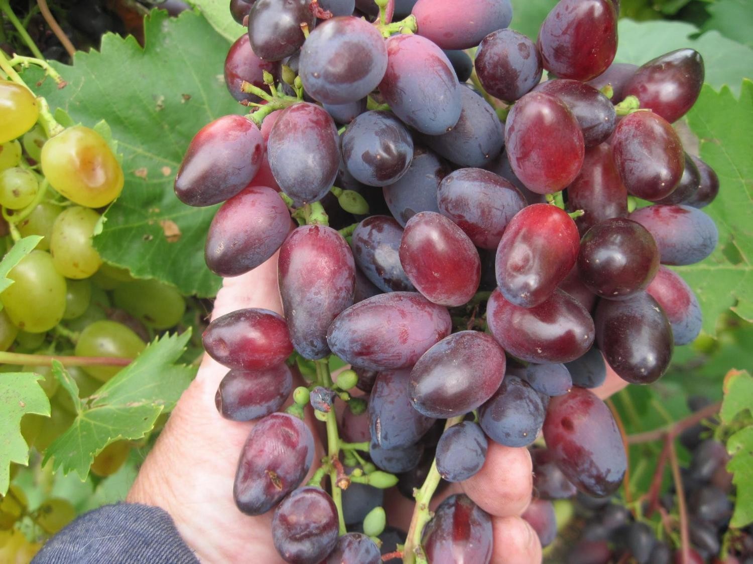 Ягоды: каждая ягода длиною в 2 – 3 см и весом от 6 до 14 граммов имеет овальную или яйцевидно-удлиненную с заостренным кончиком форму. Настоящее украшение растения – окрас ягод: градиентный с постепенным нарастанием интенсивности от нежно-розового у основания до сине-фиолетового с острого конца. Мякоть мясистая, сочная и хрустящая, кожица нежная, легко пережевываемая. Косточки мелкие, по две в ягодке. К моменту созревания в виноградинах накапливается до 18-20% сахара при кислотности сока 6 гр/л.